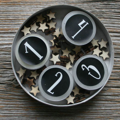 wenn der Inhalt flach ist, lässt sich der Rand der unteren Schachtelhälfte gut runterschneiden, bis die Schachtel max. 2 cm hoch ist. danach Boden und Deckel mit passend gestalteten Etiketten bekleben (VOR dem Aufkleben bestempeln oder beschriften und NACH dem Aufkleben verglimmern ;-) für die Weihnachtspost gibts drei neue Stempel