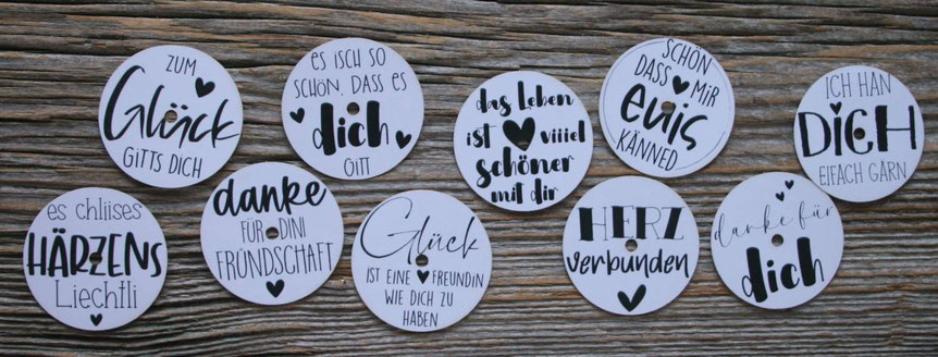 einzelne bedruckte Teelicht-Botschaften zum Verschenken, solange Vorrat