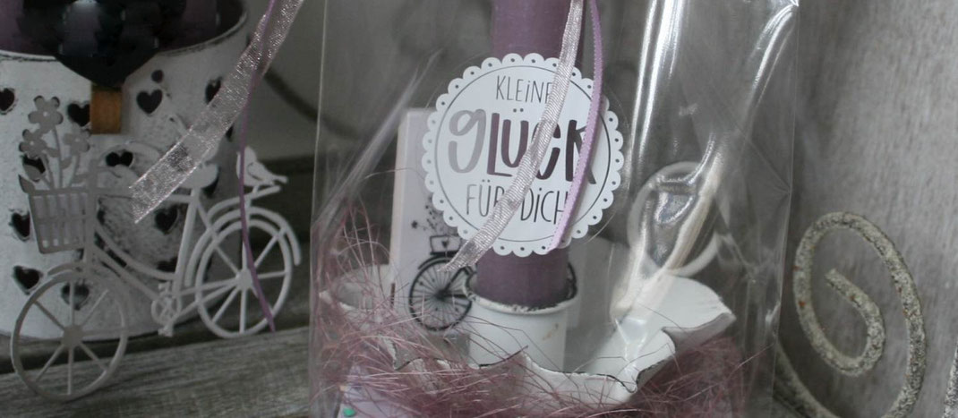 eine hübsche Kerze, ein Kerzenhalter und ein paar passende Zündhölzchen ergeben hübsch verpackt ein süsses kleines Geschenk.