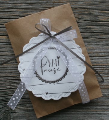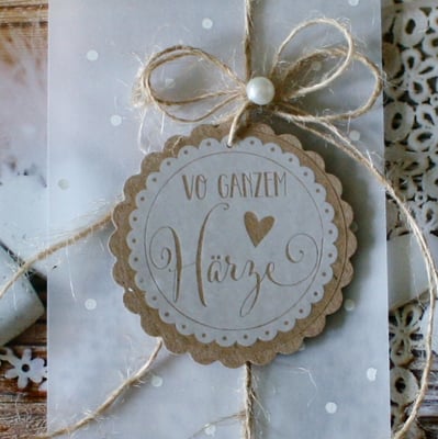 vieles braucht nicht mal eine Extra-Verpackung. einfach das Mitbringel selber etwas ausdekorieren mit Schnur oder Bast drum herum und schon ist es fertig das Geschenk. eine Perle oder ein kleines Holzherz in die Mitte der Mache verhindert, dass sie aufgeht und sieht erst noch hübsch aus...