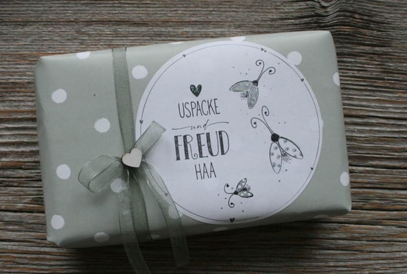 Tipp: wenn man zwei Etiketten gegeneinander klebt, kriegt man auf die Schnelle einen schönen Geschenkanhänger . sie eignen sich auch super, um ein kleines Geschenk seitlich zuzukleben ;-) (funktioniert auch bei selber gemachten Couverts aus dem Tüpflipapier. statt leimen)